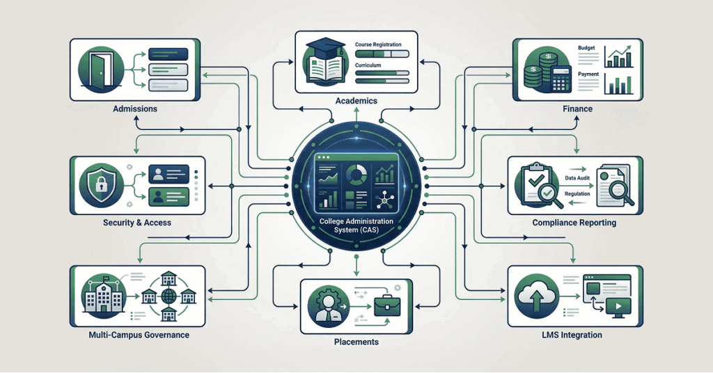 A modern College Administration System (CAS) is no longer an operational convenience. It is the digital backbone of the institution — integrating every department into a unified, governed data environment.